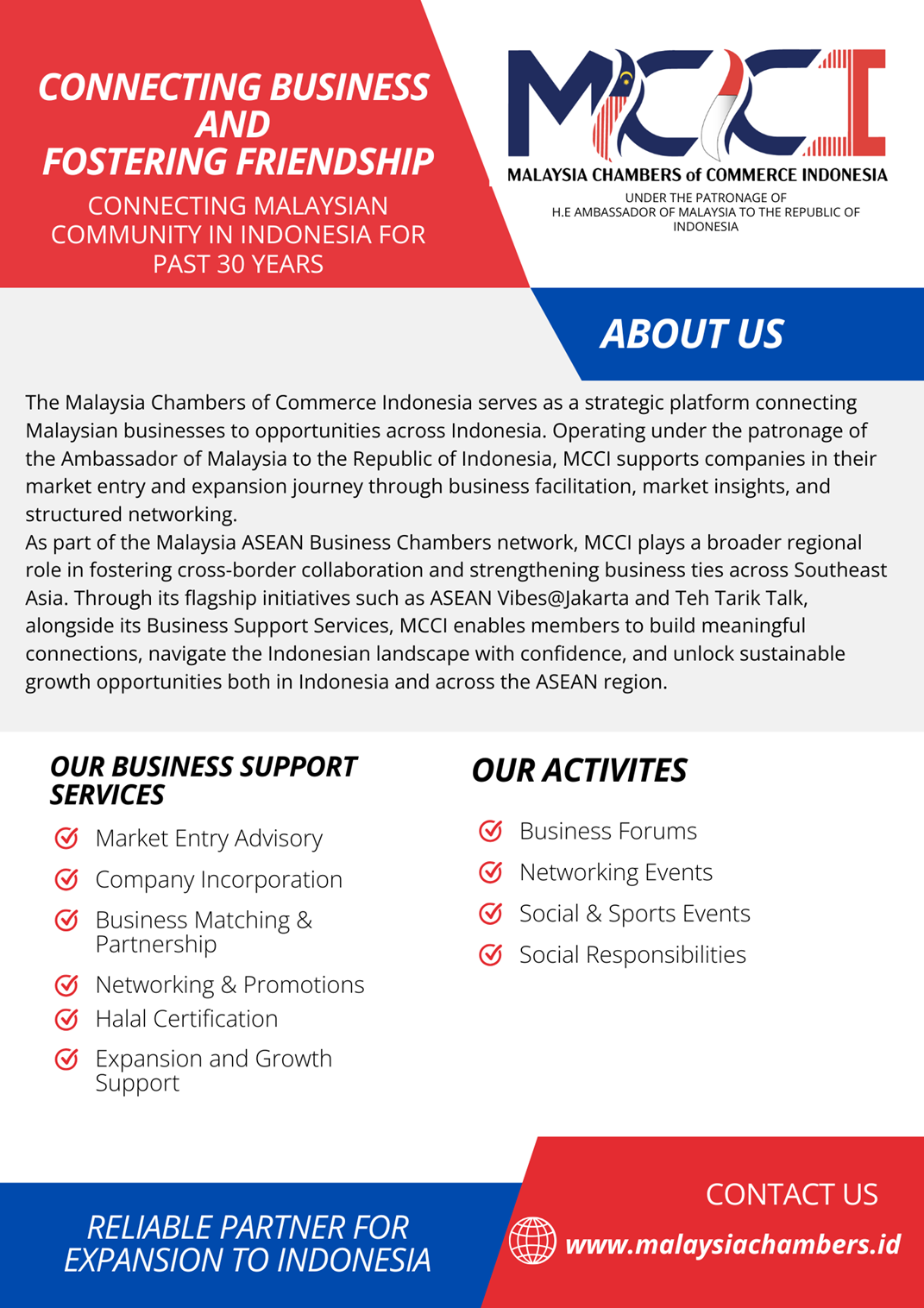 At the heart of MCCI is our commitment to building meaningful connections. Through our monthly networking platform, ASEAN Vibes@Jakarta, and our signature Teh Tarik Talk—a business forum that brings people together over the familiarity of nasi lemak and teh tarik—we create spaces where relationships are built and opportunities are unlocked. Complementing this, our MCCI Business Support Services are designed to assist Malaysian companies in navigating the Indonesian market seamlessly and effectively.